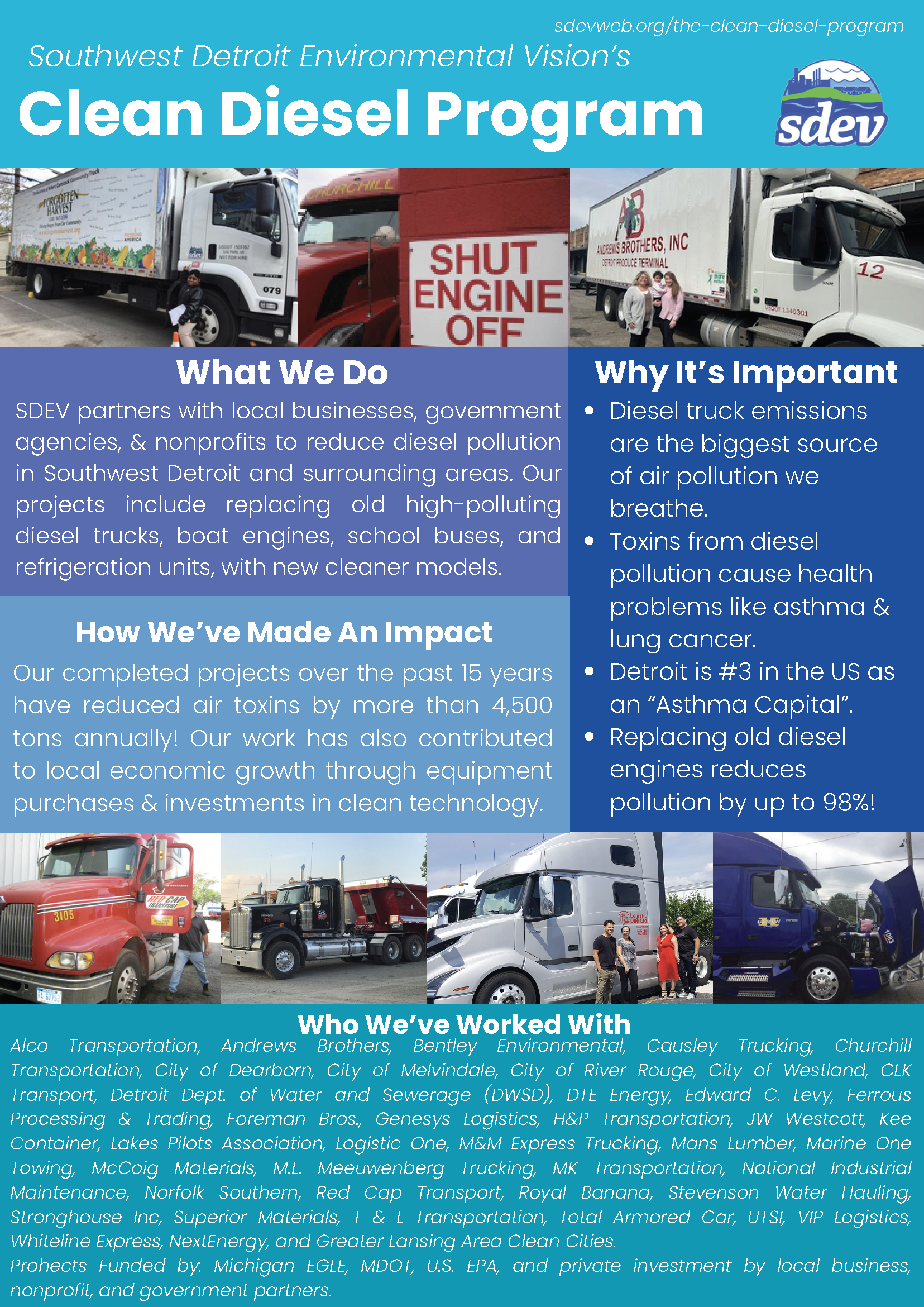Southwest Detroit Environmental Vision works with fleet partners to replace again trucks and equipment with EPA DERA reimbursement grants and with The State of Michigan Environment, Great Lakes and Energy (EGLE) grants.